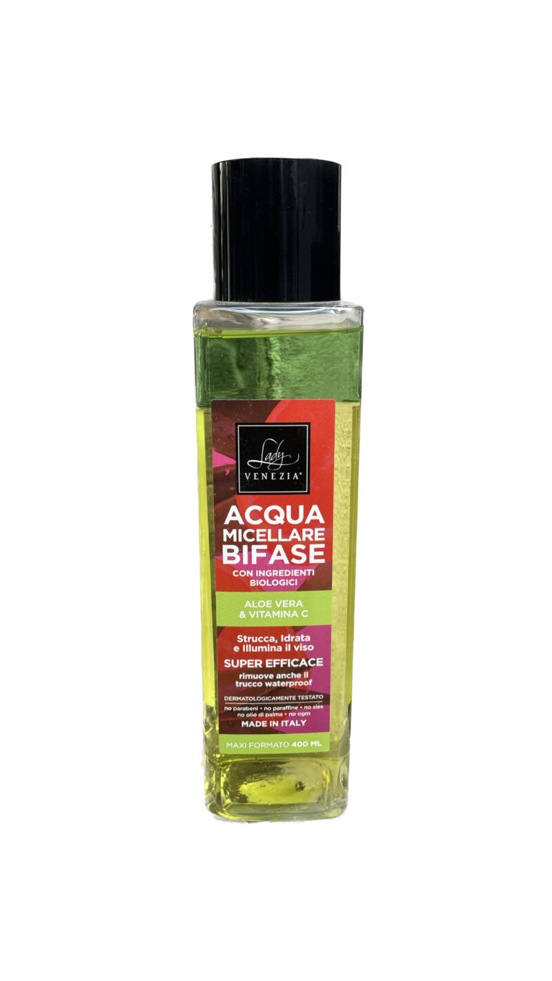 Acqua micellare bifase con ingredienti biologici. Con Aloe Vera & vitamina C strucca, idrata e illumina il viso. La sua formula è SUPER EFFICACE rimuove anche il trucco waterproof. Prodotto senza parabeni, senza paraffine, no ogm, no olio di palma e MADE IN ITALY